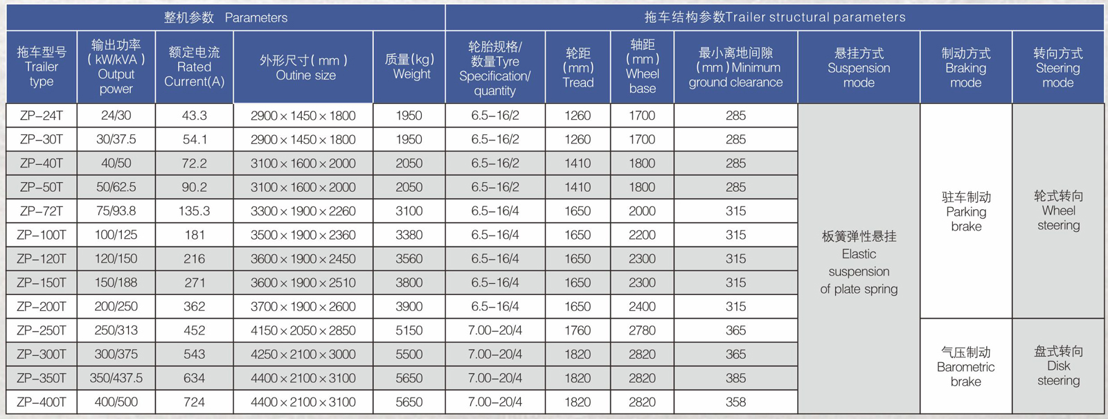 車(chē)架四角設(shè)有機(jī)械式支撐裝置,配備慣性行車(chē)制動(dòng)、駐車(chē)制動(dòng)和脫離應(yīng)急制動(dòng),確保機(jī)組在各種狀況下的安全。車(chē)架安裝四個(gè)(或三個(gè))汽車(chē)輪胎,前輪帶轉(zhuǎn)向軸,具備承受機(jī)組垂直載荷的功能的同時(shí)還具備導(dǎo)向功能。安裝于拖車(chē)上部的防雨罩、在車(chē)架上搭載機(jī)組油箱、內(nèi)嵌式電池架等結(jié)構(gòu),進(jìn)一步完善了拖車(chē)功能,可輕松用于室外運(yùn)行,即使雨天也可正常使用。